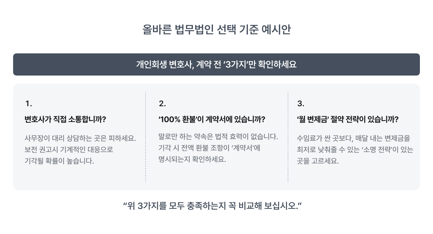 우리 로펌을 선택하라고 강요하는 대신, 개인회생 수임료를 낼 때 반드시 확인해야 할 체크리스트를 투명하게 공유해 보세요.