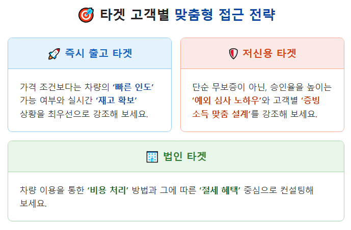 이는 단순히 '문의하기'라고 적는 것보다, '저신용 전용 심사 받기'나 '내 즉시 출고 차량 보기'처럼 타겟의 니즈를 정확히 건드리는 메시지가 2배 더 강력한 위력을 발휘한다는 사실을 증명합니다.